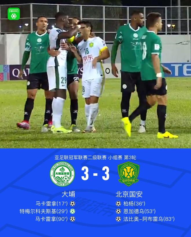 北京时间10月23日,亚冠联赛第二阶段第三轮比赛,大布对阵北京国安。大埔马卡雷纳梅开二度,特梅尔科夫斯基进球。北京国安博杨进球,恩加杜进球,阿布鲁进球。最终比分是泰布3-3北京国安。主赛事第17分钟,恩加德乌护球失误,马卡雷纳轻松射门得手。国安0-1落后大补。第29分钟,张远送点,特梅尔科夫斯基点球得手。国安0-2落后大布。第36分钟,张稀哲传球。第83分钟国安2-2泰布联手,让两人追三!大万助攻法比奥点球,国安大埔将领先优势逆转为3-2。第90分钟,马卡雷小角球抽射梅开二度。国安队3-3战平大埔。双方选手在激动人心的时刻入场。比赛第10分钟,国安前场球被抢断n 来自法庭。林良明最后一枪打高了。第13分钟,大布反击,最后射门被博杨挡出。第17分钟,恩加德乌护球失误。马卡雷纳轻松推射成功。国安0-1落后大补。第25分钟,张稀哲主罚任意球,皮球传中。第29分钟,张远送点,特梅尔科夫斯基点球得手。国安0-2落后大补。第36分钟,张稀哲传球。博阳转身望月,重获胜利。第39分钟,国安1-2落后大布。 ,两次击中国安前场,并将球挡出。第45分钟,大布反击。特梅尔科夫斯基投篮不中。第47分钟,马卡雷头球攻门,皮球偏出球门。第53分钟,恩加德乌补射混乱补射得手!第60分钟,国安2-2追平大浦。第60分钟,出现悬念犯规了。林良铭的进球被判越位。第70分钟,国安前场获得机会。第78分钟,法比奥最后一次射门被挡出。内内姆挺身而出犯规,吃到黄牌。第83分钟,二队追三!大万助攻法比奥得分,国安3-2逆转大布领先。第87分钟,保利诺禁区内完成射门,皮球偏出偏出。第90分钟,库姆马卡雷小角度抽射梅开二度。国安3-3打平大补。球队阵容 技术统计