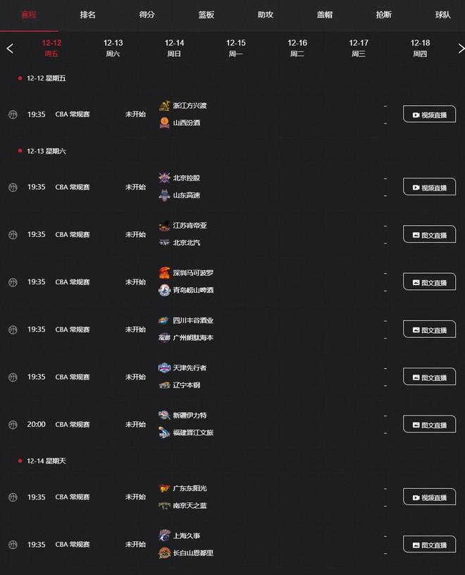 Noong ika -8 ng Disyembre,oras ng 北京,可能会 apat na araw lamanghanggang sa pagsisimula ng bagong panahon ng CBA。 Opisyal na na -update ng CCTV 和 listahan ng 节目para sa bagong panahon ng CBA。从节目列表中我们可以看到,央视对CBA比赛的转播计划以图文直播为主,少量比赛将通过视频直播。整理完毕后,央视当期节目单公布了未来7个比赛日(12月12日-12月18日)的转播计划。这7个比赛日共有27场比赛,其中只计划转播三场比赛,分别是揭幕战广厦对阵山西、北控对阵山东、广东对阵南京。 Ayon sa mga nakaraang ulat mula sa maraming mga mamamahayag at mga tao sa media, kahit na ang bagong panahon ng CBA ay malapit nangstart, 如果是在电视或在线平台上,目前还不清楚联赛将如何转播以及是否每场比赛都可以转播。